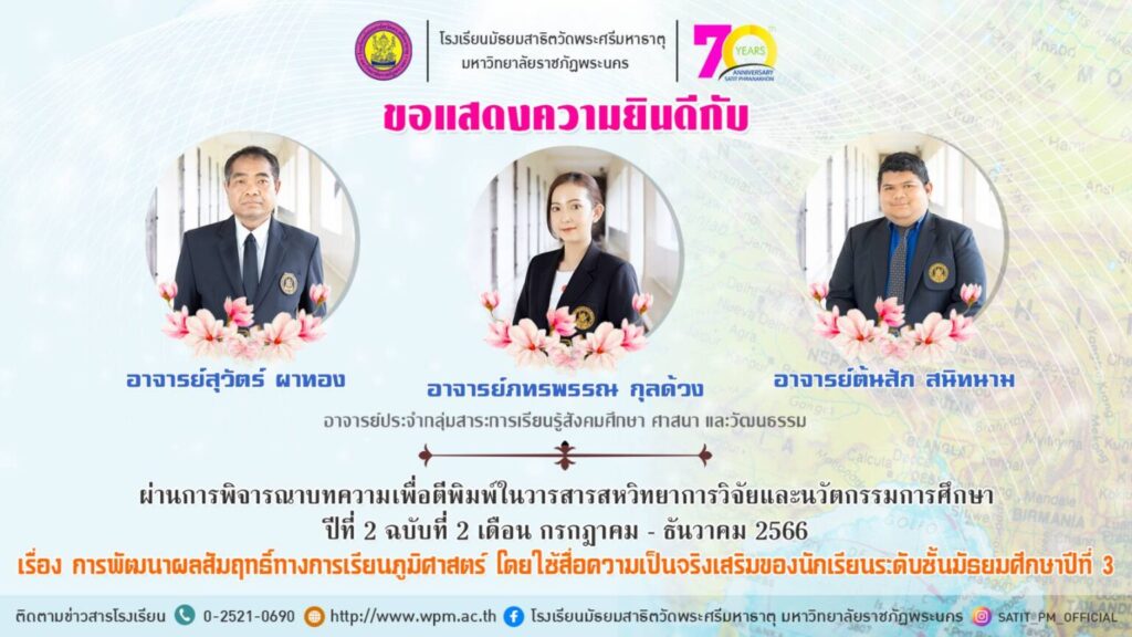 ขอแสดงความยินดีกับอาจารย์สุวัตร์ ผาทอง อาจารย์ภทรพรรณ กุลด้วง และอาจารย์ต้นสัก สนิทนาม อาจารย์กลุ่มสาระการเรียนรู้สังคมศึกษา ศาสนาและวัฒนาธรรม เนื่องจากผ่านการพิจารณาบทความเพื่อตีพิมพ์ในวารสารสหวิทยาการวิจัยและนวัตกรรมการศึกษา ปีที่ 2 ฉบับที่ 2 เดือน กรกฎาคม – ธันวาคม 2566 เรื่อง การพัฒนาผลสัมฤทธิ์ทางการเรียนภูมิศาสตร์ โดยใช้สื่อความเป็นจริงเสริมของนักเรียนระดับชั้นมัธยมศึกษาปีที่ 3